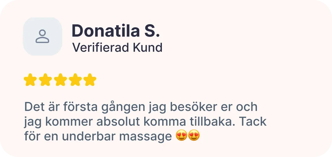 Friskvårdsmassage kan kännas på spända områden, men det är en behaglig och välgörande känsla. Trycket anpassas alltid efter dina behov, och eventuell ömhet är ett tecken på att musklerna släpper på spänningar. Efteråt man en lättnad, ökad rörlighet och en skön avslappning i kroppen.